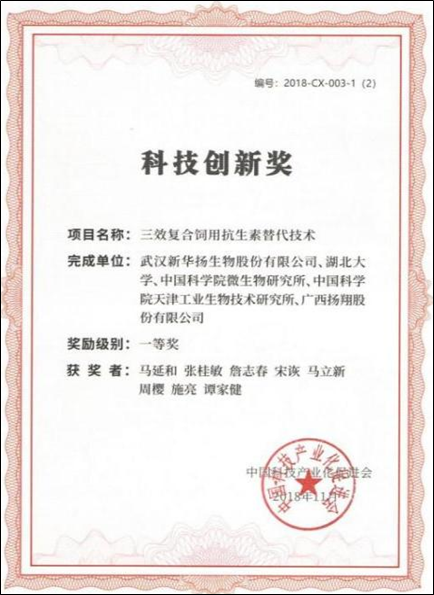 马立新同志关于三效复合饲用抗生素替代技术的证书